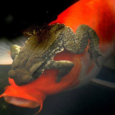 臺灣蟾蜍發(fā)情抱緊鯉魚 在中國臺灣地區(qū)臺東縣一個農(nóng)場的池塘里,一只蟾蜍正趴在一條鯉魚身上緊緊不放。據(jù)農(nóng)場主人介紹,這只蟾蜍很明顯正處于發(fā)情期。不管這條鯉魚如何持續(xù)地激烈掙扎,蟾蜍都死死地抱緊鯉魚的身體。這種現(xiàn)象已持續(xù)一個月之久,農(nóng)場主人準備將它們打散。