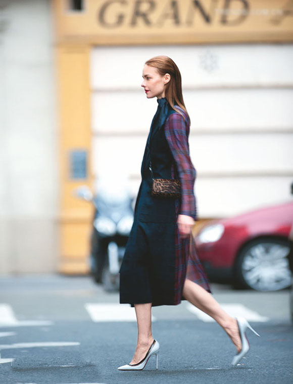 隱約露出小腿的開衩設計是讓風衣也變得性感的秘密武器,豹紋印花的精致挎包不可或缺。