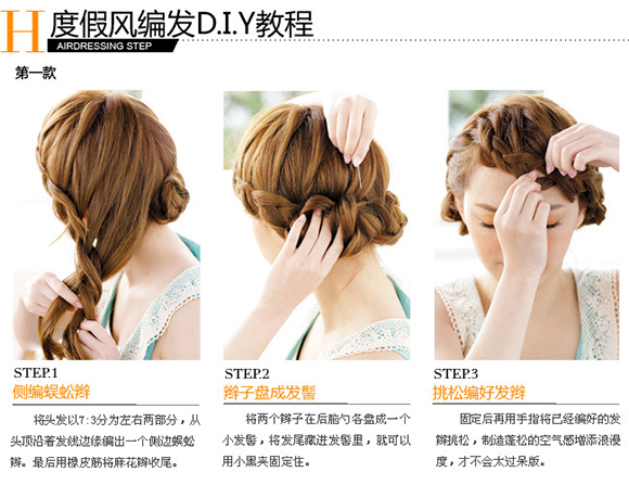 利用蜈蚣辮做出的簡單變化,效果就像頭上帶著桂冠一般,既清爽又同時具有女神般的浪漫感,是難得不需要電卷也可以呈現出的簡單浪漫發型。兩側的辮子只要往后盤就更顯高雅,收干凈的編發也很適合度假時光。
