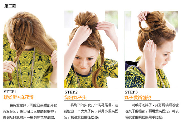 帶有活力又有朝氣的丸子頭,只要加上麻花編發(fā),就能帶入度假感and女孩度up!這款高高的梳起丸子頭,不但輕松方便,看起來還有減齡的效果。如果你想要多點變化,前發(fā)的蜈蚣辮就是最棒的道具哦。