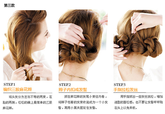 如果你覺(jué)得丸子頭不夠新奇,那么就試試優(yōu)雅兼俏皮的麻花發(fā)髻吧。這款低發(fā)髻最大的亮點(diǎn)就在于雙麻花辮的內(nèi)扣,像是俏皮的卷發(fā)筒,又像是優(yōu)雅盤(pán)起的頭發(fā),上面再配上發(fā)飾,或者直接戴上帽子,都不影響往后收的發(fā)髻效果哦!