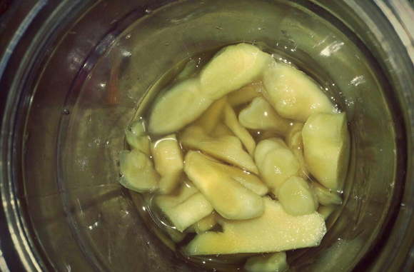 生姜100克洗凈切成細絲,放在250毫升老陳醋中密封3日,每日早晨空腹服用10毫升,可治療慢性淺表性胃炎以及慢性萎縮性胃炎。