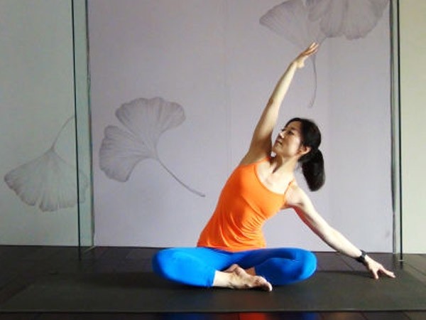 雙腿盤坐地板,一只手張開放于身側,另一只手舉過頭頂貼耳連帶身體向同方向彎曲。保持10秒鐘左右,反方向再做一次。