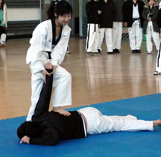 對方突然從背后用左手抓住女子衣領向后拉,女子立即向右后方向轉身,用右臂反繞對方的左臂,左手變拳直擊對方雙眼、左膝頂對方擋部,并迅速制服對方。